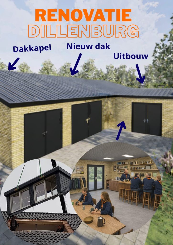 Ons clubhuis de Dillenburg is al jarenlang het hart van onze scouting: een plek waar de bevers en dolfijnen hun opkomsten hebben, en in de winter het onderhoud van onze lelievletten plaats vindt en de waterscouts en explorers hier ook hun plekje vinden. Daarnaast hebben we hier ook onze weekenden en andere bijeenkomsten.. Door intensief gebruik en de tand des tijds is het dak van ons clubhuis echter dringend toe aan vernieuwing. Daarnaast willen we de entree verbeteren en uitbreiden, zodat deze beter aansluit bij onze huidige en toekomstige leden en bezoekers.